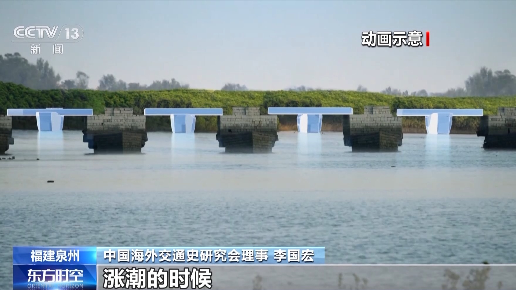中国海外交通史研究会理事 李国宏:想在洛阳江上建一座跨海大石桥,潮汐是最重要的因素,所以洛阳桥建造当中应用到很多技术手段都跟潮汐有关。首先就是筏型基础的运用。