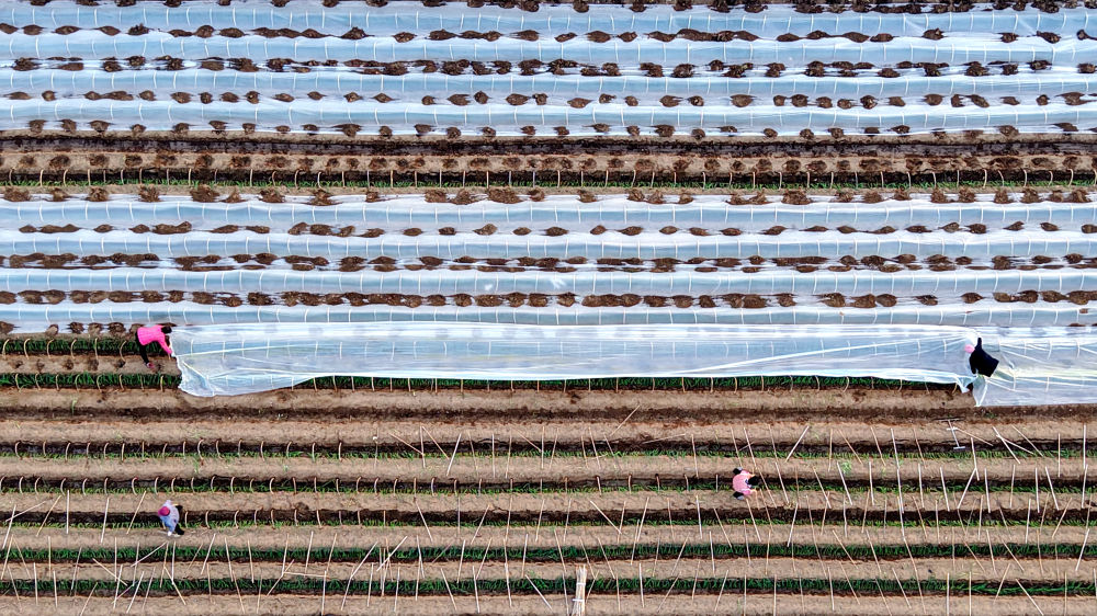 12月11日,在山东省临沂市平邑县地方镇,村民为种植的蔬菜幼苗覆盖保温薄膜(无人机照片)。 新华社发(武纪全摄)