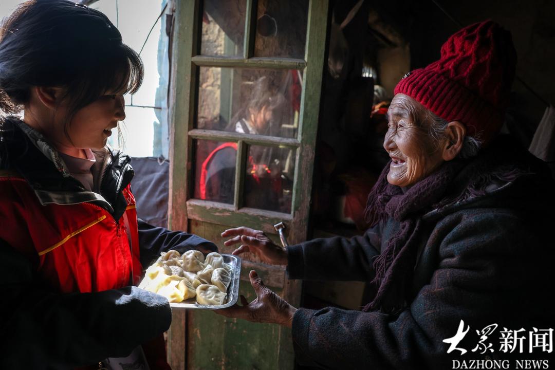 9岁的小志愿者刘梓瑜为88岁的李元花送来饺子。