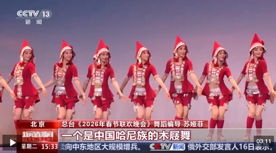 总台《2026年春节联欢晚会》舞蹈编导 苏娅菲:这次的作品中有中国的两个不同的舞种,一个是哈尼族的木屐舞,一个是中国傈僳族的阿尺木刮,它也是国家级非遗。还有两支来自国外不同的团队,一个来自匈牙利,表演的是匈牙利的莱盖涅什,是他们的传统民族舞蹈,一个是西班牙的一支舞蹈团,表演的就是弗拉门戈。