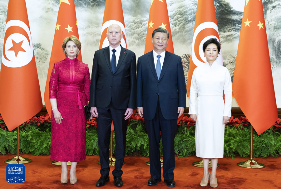 5月31日上午,国家主席习近平在北京人民大会堂同来华国事访问并出席中国-阿拉伯国家合作论坛第十届部长级会议开幕式的突尼斯总统赛义德举行会谈。这是会谈前,习近平和夫人彭丽媛在人民大会堂东门外广场为赛义德和夫人伊什拉芙举行欢迎仪式。新华社记者 殷博古 摄