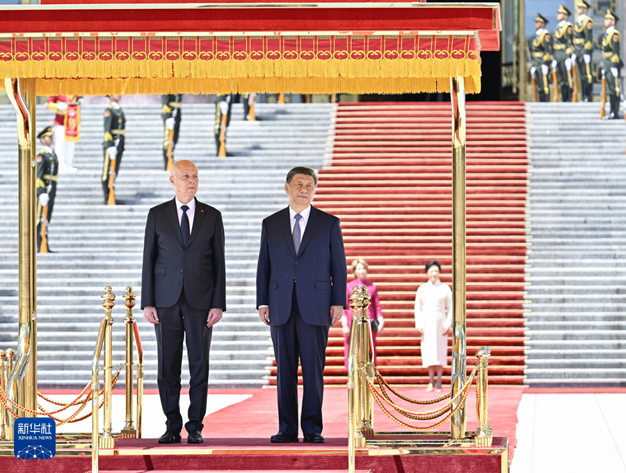 5月31日上午,国家主席习近平在北京人民大会堂同来华国事访问并出席中国-阿拉伯国家合作论坛第十届部长级会议开幕式的突尼斯总统赛义德举行会谈。这是会谈前,习近平在人民大会堂东门外广场为赛义德举行欢迎仪式。新华社记者 翟健岚 摄