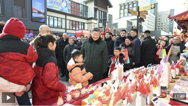 总书记察看街区风貌和各式年货摊位,同现场群众亲切交流。他愉快地向大家讲起年少时多次到隆福寺的情景,还购买了特色食品和文创产品。