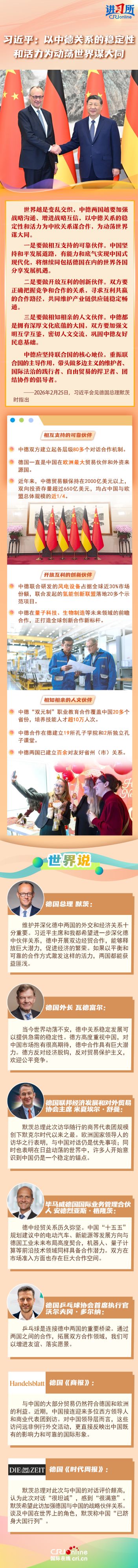 2月25日,中国国家主席习近平在北京会见来华进行正式访问的德国总理默茨,就下一步中德关系发展提出三点意见:一是要做相互支持的可靠伙伴、二是要做开放互利的创新伙伴、三是要做相知相亲的人文伙伴。习近平指出,世界越是变乱交织,中德两国越要加强战略沟通、增进战略互信,以中德关系的稳定性和活力为中欧关系谋合作,为动荡世界谋大同。