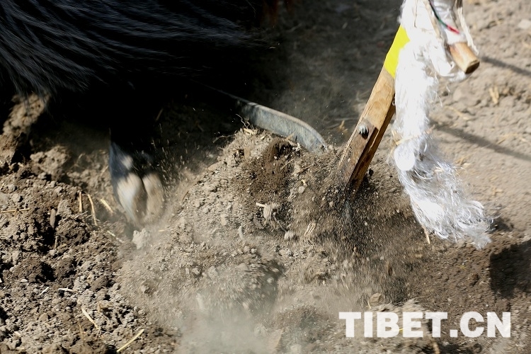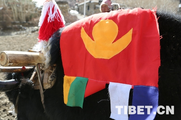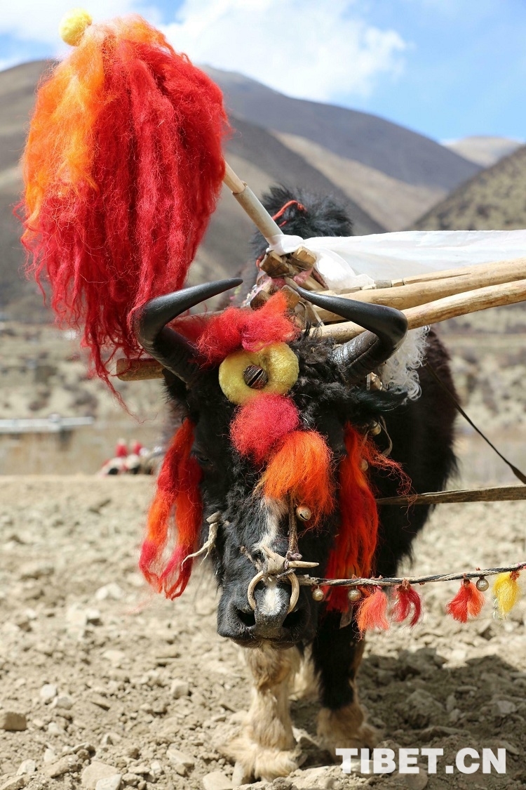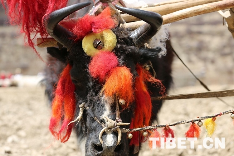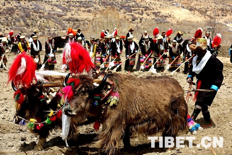 上午10时30分许,随着两头头戴红缨(防止被秃鹫等大鸟伤害的装饰)、鼻子带铃铛(预示着把田里的害虫赶跑)的健壮牦牛以“二牛抬杠”的方式犁开第一块地,寂静的村庄突然响起此起彼伏的欢呼声,洁白的哈达在每头耕牛角上飘起,牛背上装饰着日月辉映的彩布,牛角用清油擦得亮亮的,角尖上还贴着蝴蝶状的酥油花,在牛身上绑上长长的彩棒,彩棒上有随风飘动的彩旗,牛尾还拴着五颜六色小球状的羊毛,这种“二牛抬杠”的耕地场景历史悠久,几乎是中国农耕文化中的活化石,现在也许只能从春耕仪式中看得到了。