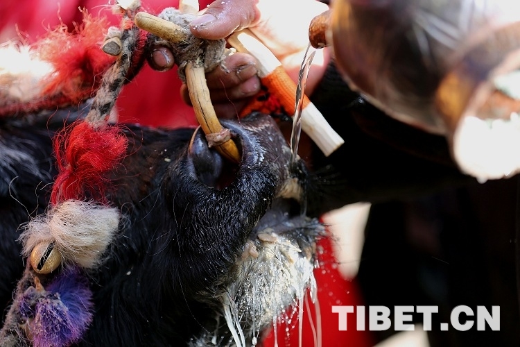 图为:3月16日,琼结县琼结镇雪康村春耕仪式上,村民给耕牛灌青稞酒。