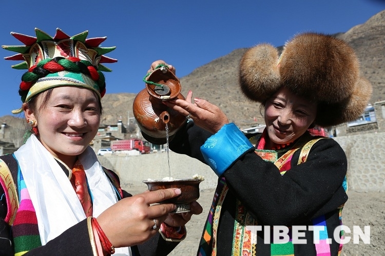 图为:3月16日,琼结县琼结镇雪康村春耕仪式上,敬献青稞酒的家庭主妇。