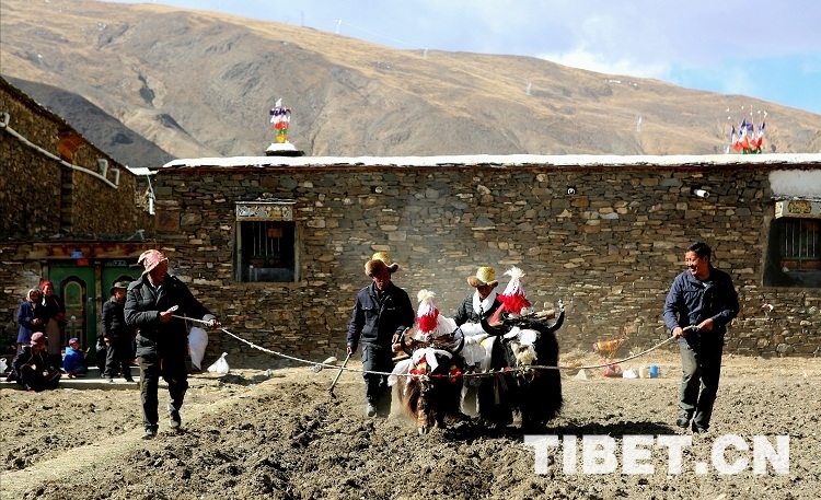 据村里老者讲,春耕的第一犁,由一个属当年属相的妇女撒出吉祥、幸运的种子,其余的耕牛一对跟着一对地翻耕。耕牛方阵绕过数圈之后,播种者们站在田地中间,接受村委会及驻村工作队统一献上的哈达。现场,彩旗飘扬、桑烟缭绕。每对耕牛后面都跟随着一位盛装的妇女,她们左手提一桶种子,右手有节奏地挥摆。耕牛犁出一条直线,他们就这样把种子撒入希望的田野,预示着来年的丰收和人畜兴旺!