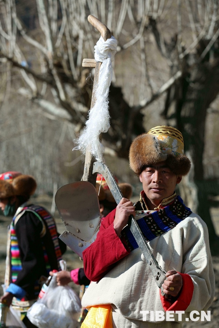 图为:3月16日,琼结县琼结镇雪康村春耕仪式上,扛着铁犁的犁耙手。
