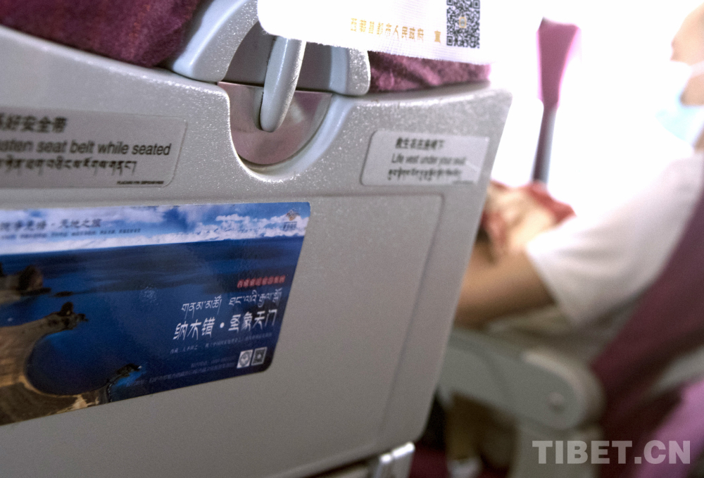 这是在西藏航空公司执飞的客机舱座后所张贴的“圣象天门”招贴图(唐召明2020年8月17日摄)