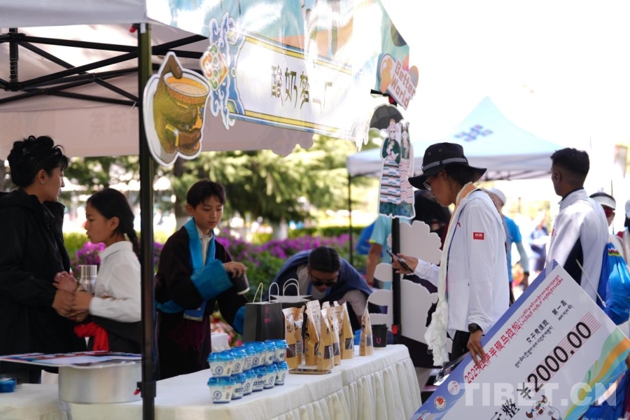图为特色展示区工作人员为参赛选手介绍西藏特色酸奶并赠送品尝