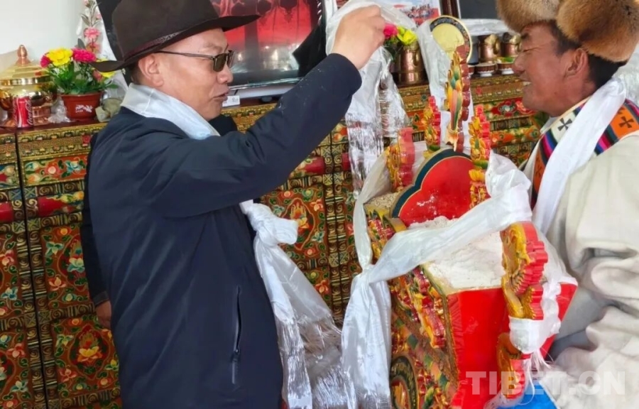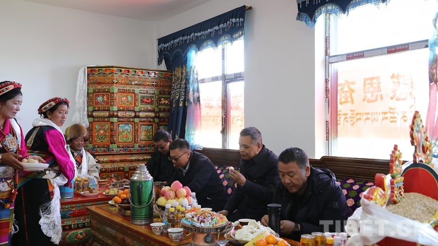 图为群众向当地干部敬献切玛,干部撒切玛以祝福群众乔迁新居