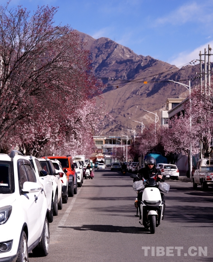 放眼望去,一树树春花争相绽放,在春日的暖阳下显得格外耀眼夺目。在这条被春花装扮一新的街道上,随处可见市民悠然自得的身影——有人漫步行走在花间道路,沉醉于满目春色;有人静坐在茶馆门外的桃花树下,一边品味甜茶的醇香,一边享受春日的惬意时光。花影、人影与街景交相辉映,处处洋溢着春日拉萨的生机与浪漫。