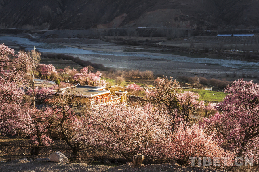光影中的道孚杏花和民居