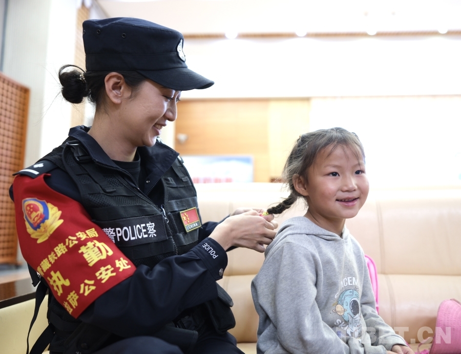 图为5月31日,马晓琴在执勤时,深受小朋友的喜爱,拉着格桑花辫起头发,想要跟格桑花一样靓丽 摄影:贺瑞明