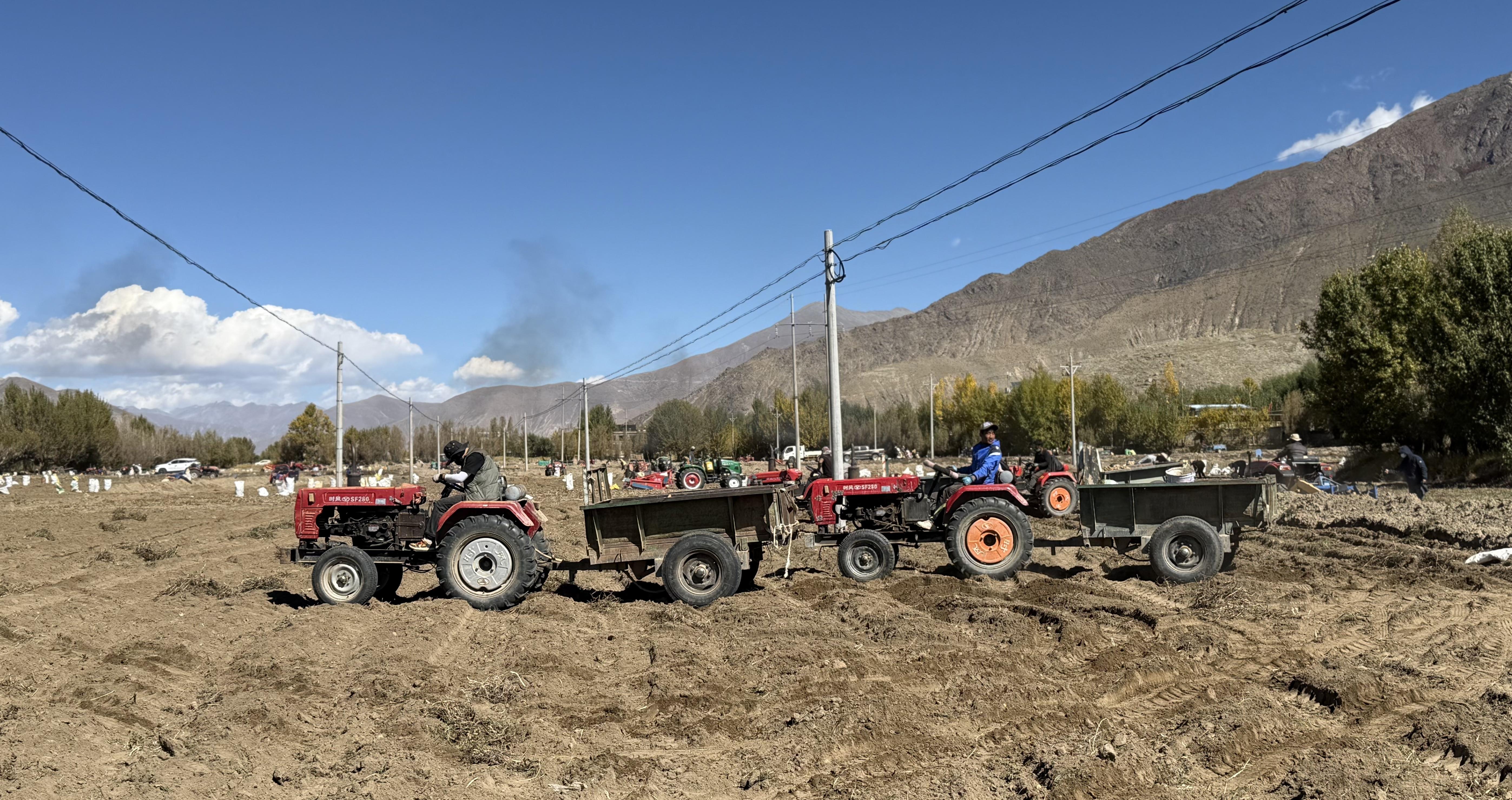 图为南木林县艾玛乡山巴村村民正在使用机械收获土豆