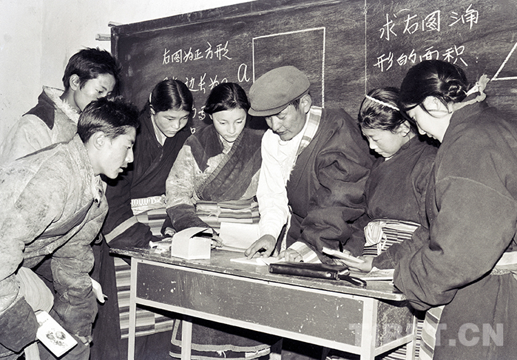 这是班戈县小学校长申却坚村在给学生上课(唐召明1987年摄)