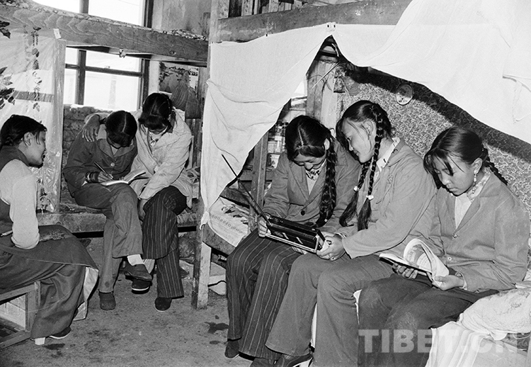 这是班戈县中学寄宿女学生在宿舍里听广播和学习(唐召明1987年摄)