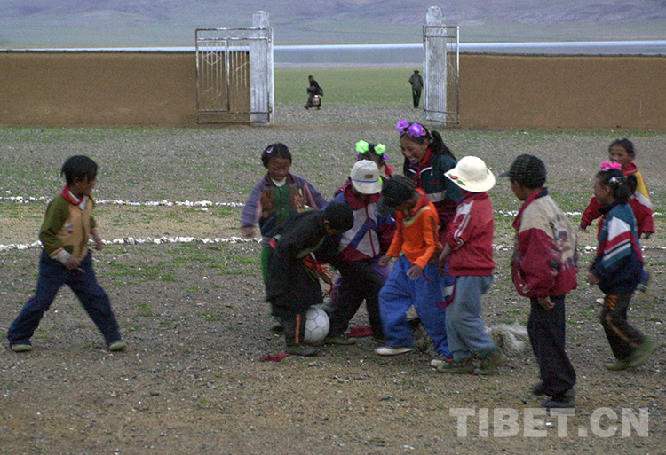 这是双湖特别区(从双湖办事处改名而来,现为双湖县)嘎措乡小学学生在课余时间踢足球(唐召明2001年摄)
