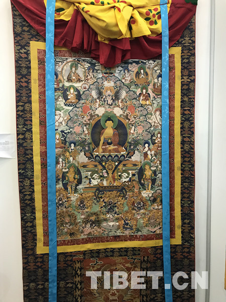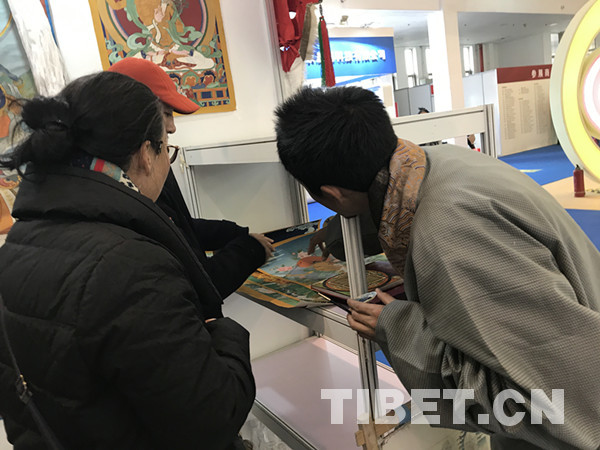 图为在“2017年北京市支援合作地区特色产品展销会”上,赤增绕旦展出的唐卡作品。