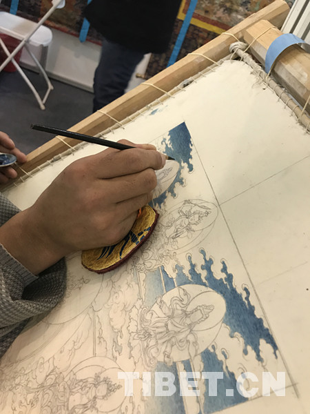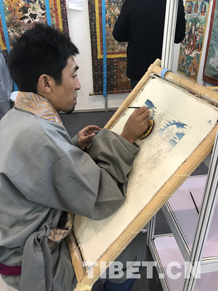 中国西藏网讯 相传,雍仲苯教的创始人辛饶米沃首先创造了古象雄文字,他将绘画、雕塑、佛塔建设的工巧明学传授给了当时被称为“工巧王”的嘎玛尼秀,为象雄绘画艺术奠定了理论基础。嘎玛尼秀随后又招收了六大弟子,完善了象雄绘画艺术体系。象雄绘画艺术传承至今,是藏文化传统艺术的重要组成内容。在“2017年北京市支援合作地区特色产品展销会”上,西藏自治区一级唐卡画师、象雄绘画非遗项目负责人赤增绕旦带着唐卡作品参加了展会。