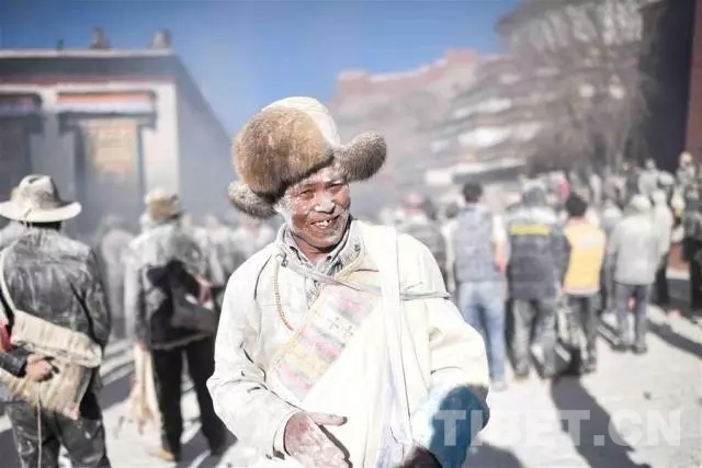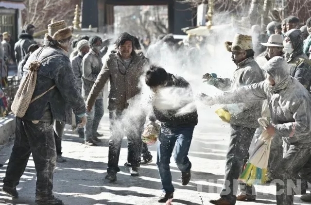 一把把白色的糌粑在人们相互追逐间抛撒开来,仿佛天上下起了大雪,四散飞扬的糌粑粉,满含着人们新年的祝福和对美好生活的向往。“糌粑洒在身上,寓意吉祥庇佑,但凡身上干干净净的人,都会被众人撒上糌粑,献上吉祥的祝福。”达瓦大叔一边用手拍打头发,抖掉头发里的糌粑,一边笑着解释。