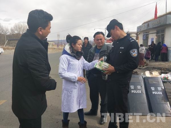 甘孜县卫计局组织的医疗队来到石门坎、拖坝、雅桥3个卡点,为昼夜值守在一线卡点的干警和民兵送医送药送关怀,为他们测血压、量体温、讲解预防感冒、肠炎、高血压等疾病常识,对因严寒导致感冒的干警,送去感冒药和体温计。