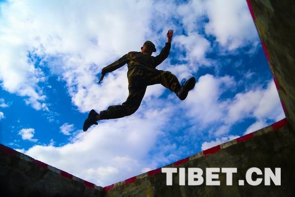 图为四百米障碍跑之飞跃高跳板 陆文凯 摄
