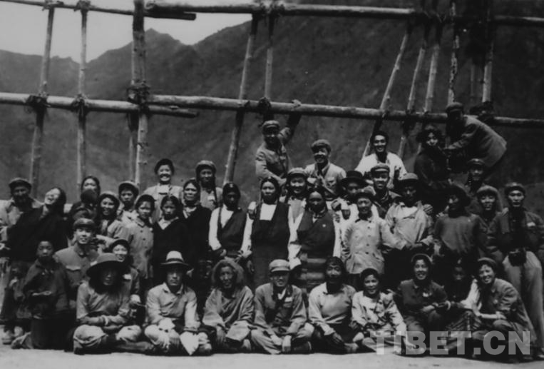 图为西藏文工团老照片:进军途中与藏族同胞在一起