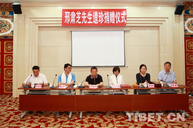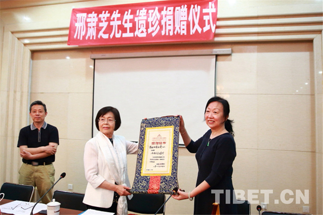 图为捐赠仪式现场,邢肃芝先生遗孀张志雯女士发表讲话。她介绍了邢肃芝先生的生平及他一生立志为弘扬西藏文化、促进汉藏文化交流所做出的卓越贡献。