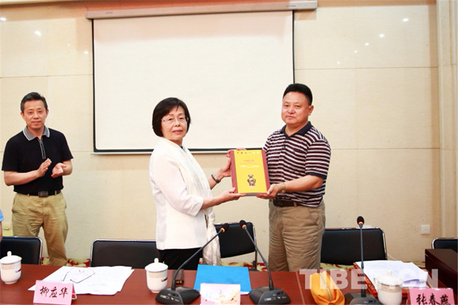 图为西藏文化博物馆副馆长扎呷向张志雯女士敬献礼物。