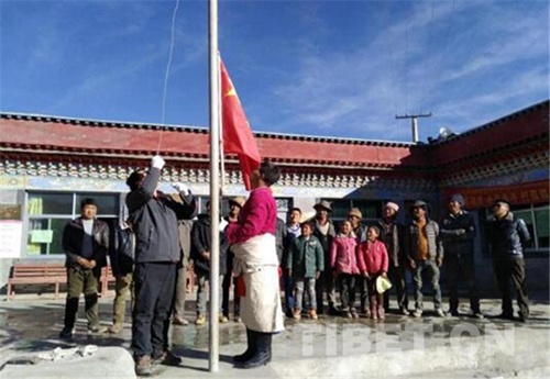 图为扎西平措参加村里的升旗仪式。