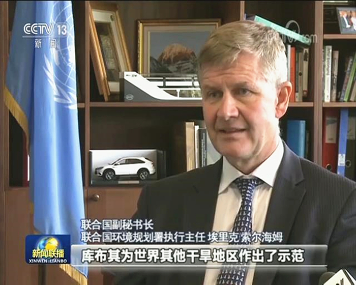 图为埃里克•索尔海姆对库布其模式的肯定 图片来自新闻联播