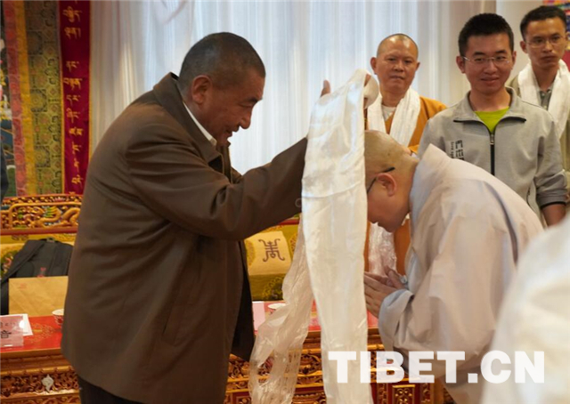 图为珠康•土登克珠活佛向来宾献哈达 摄影:王淑