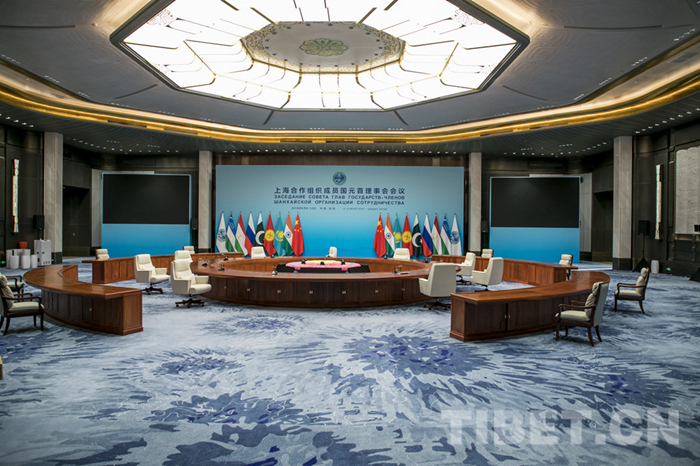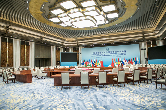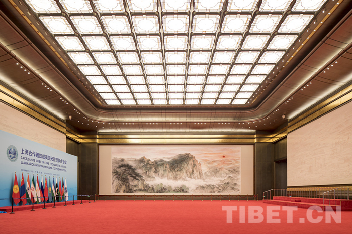 黄河厅顶部采用了中国传统建筑的藻井元素,边缘还装饰有饕餮纹。会议厅两侧,万里奔腾的河水化为墙面上的艺术雕纹,波澜壮阔、滚滚前行。大厅正中,“上合蓝”的背景板前,成员国国旗依次排开,定格上合组织扩员后8国领导人聚首青岛的历史性时刻。