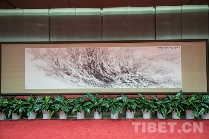 泰山厅门口走廊装饰着戴淑娟的梅花主题国画作品《只留清气满乾坤》,以梅花象征坦荡高洁的胸怀和品质。