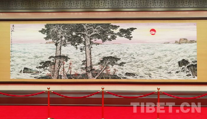 黄河厅外的巨幅山水画《东方红》,黄河奔腾东去,一轮红日高悬,画面大气磅礴。