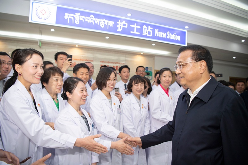 7月27日,李克强总理来到西藏自治区人民医院,看望慰问援藏医护人员。来源:中国政府网