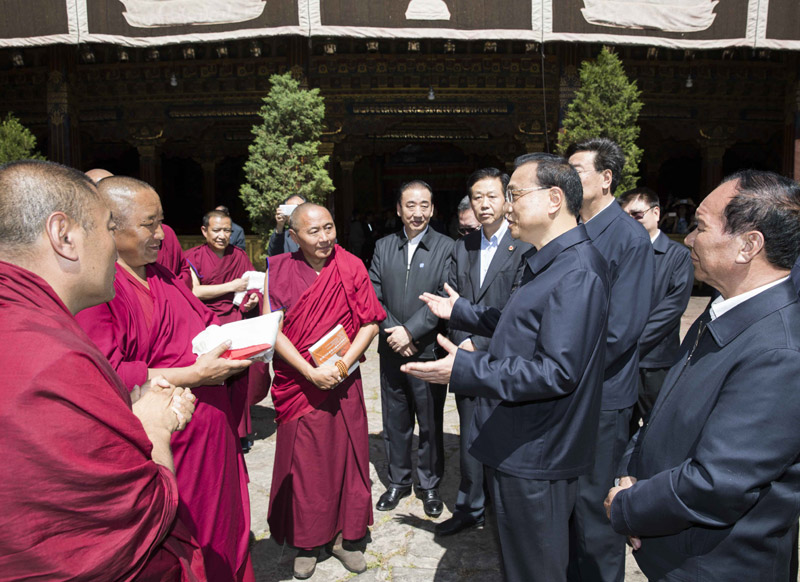 7月26日下午,李克强总理来到拉萨市大昭寺看望慰问西藏宗教界人士。始建于653年的大昭寺是西藏现存最辉煌的吐蕃时期寺庙建筑。李克强向西藏广大宗教界人士致以诚挚的问候和衷心的祝福。他说,大昭寺是藏传佛教的圣殿,同时见证了汉藏和亲、民族团结的光辉历史。希望西藏广大宗教界爱国人士要以历辈高僧大德为榜样,为维护祖国统一、民族团结、社会和谐作出有益贡献,促进宗教和睦、佛事和顺、寺庙和谐。祝愿大家精修得道、身体健康、扎西德勒!