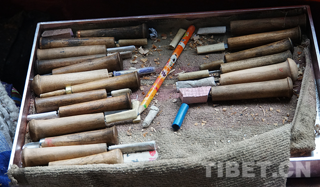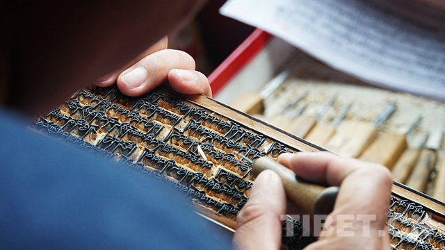 据白玉寺工作人员介绍,《前译教言》由112部书组成,本来已轶,经过寺院30多年的悉心收集、整理,重新恢复雕刻了该典籍的经版,为传承传统文化做出贡献。图为刻经的匠人,多来自西藏自治区昌都市江达县。摄影:杨悦笙(中国西藏网 记者/杨悦笙)