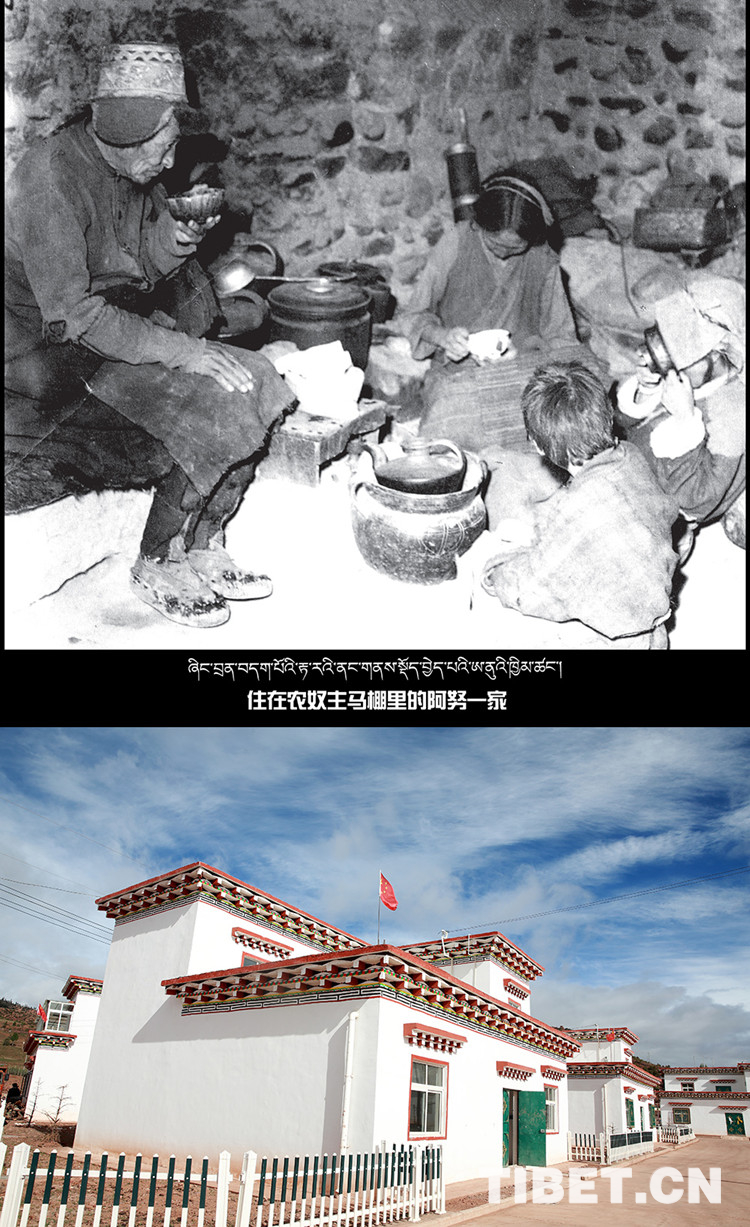 上图:住在农奴主马棚里的阿努一家。图片来源:西藏日报 下图:西藏昌都芒康县嘎托镇普拉村独具藏家特色的小洋楼。摄影:陈卫国