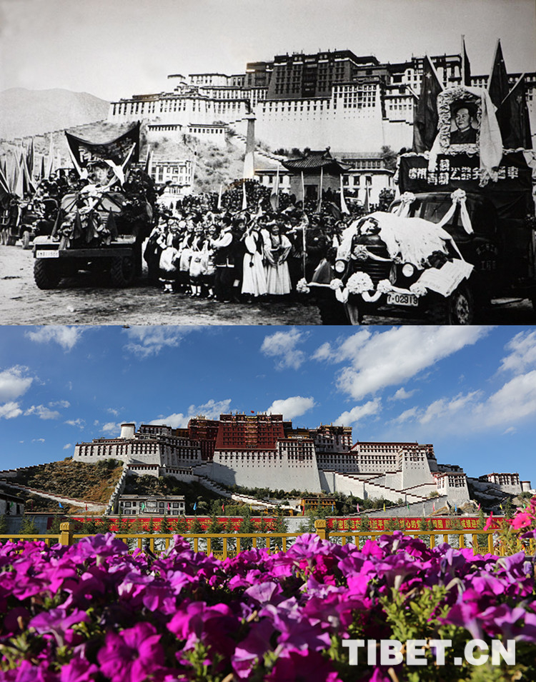 上图:1954年12月,举世闻名的康藏、青藏公路全线胜利通车到拉萨。图片来源:《西藏自治区画集》 下图:布达拉宫前花团锦簇。摄影:王淑