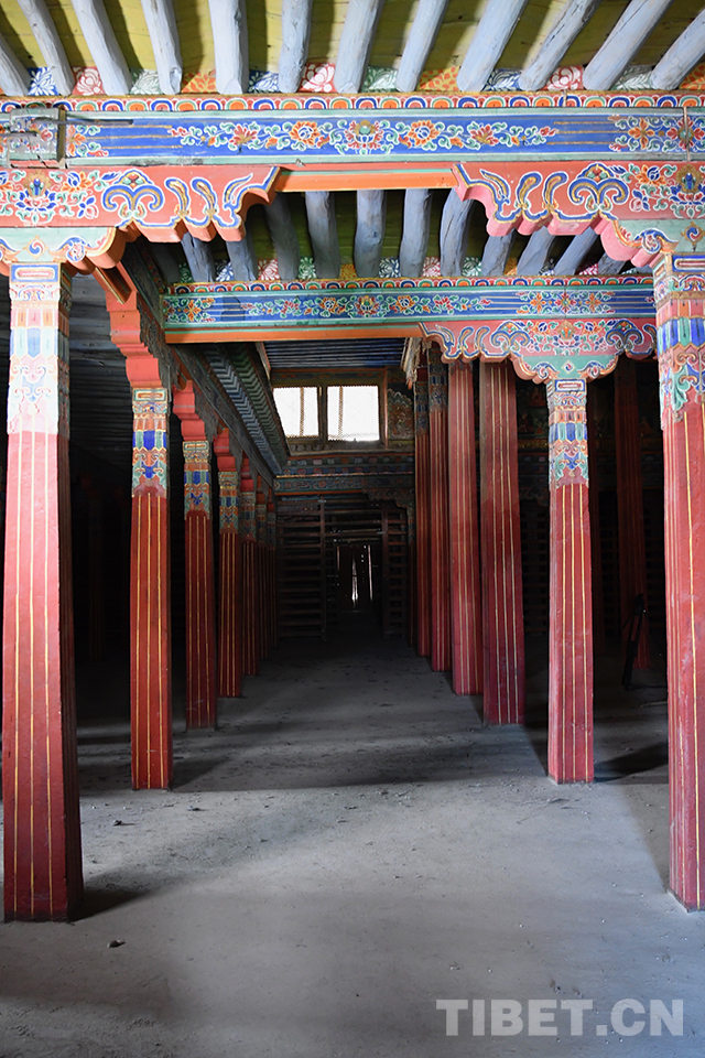 推开尘封许久的木门,沉寂许久的雪西印经院迫不及待地发出“信号”,让来人关注其内部陈设。等到打开一扇扇窗户,一缕缕光线将这里从过往的曾经拉回到现在时,众人不禁惊叹这眼下的美。镶嵌着雕花的柱子排列整齐地将视线展开:壁画色彩艳丽、木板架子排列有序、木门已多处凹陷……一切都仿佛在讲述着丰富的历史故事。