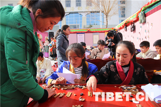 “迪孜”也叫“石子算法”,是由生活中常见的小石子、小木棍和核桃等物品作为筹码进行计算的一种传统筹算技艺,目前已经被列为西藏自治区级非物质文化遗产。同时,“迪孜”已成为拉萨师范高等专科学校的兴趣课,在学校进行传承。在非遗进校园活动现场,“迪孜”的传承人们背着朗朗上口的口诀,在老师的指导下为同学、文化工作者们展示着“迪孜”的魅力。