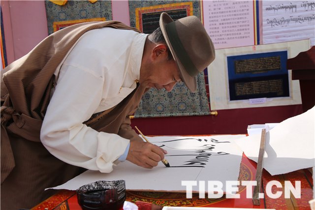 图为活动现场藏文书法家演示藏文书法。