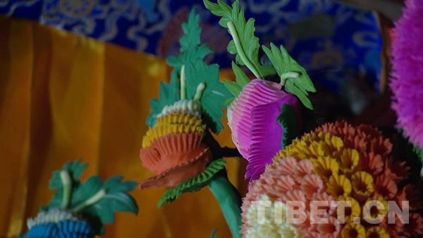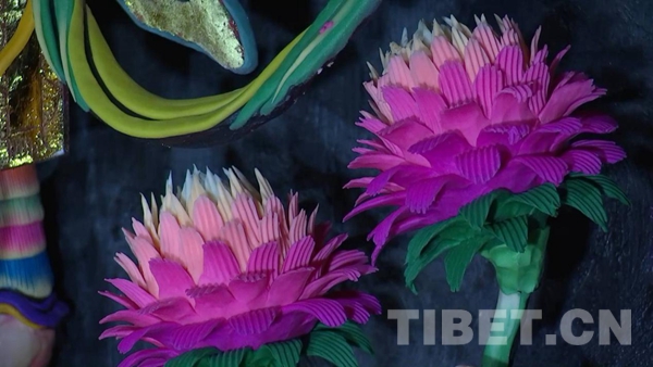 酥油花是用酥油作原料制作的一种特殊形式的雕塑艺术,它与唐卡、壁画并称为藏传佛教艺术的“三绝”。相传最早起源于西藏,已有1300多年历史,藏语意为“鲜花贡品”,主要用牦牛酥油纯手工制作出各色精美雕塑,供奉在佛像前。