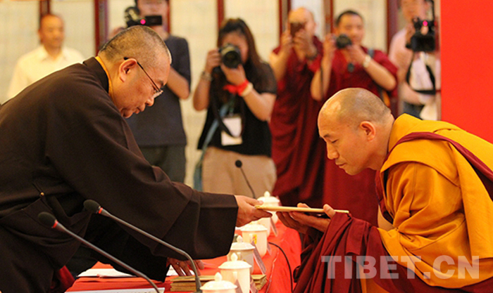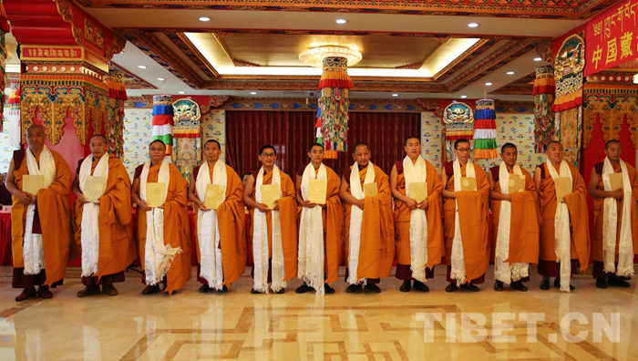 嘉木样活佛向拓然巴获得者授予证书。 (图片由中国藏语系高级佛学院提供)