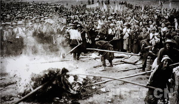图为1959年夏,拉萨达孜县塔杰乡、章多乡翻身农奴焚烧地契、文契和债约。摄影:陈宗烈