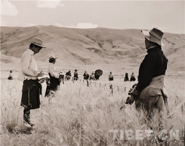 图为丈量土地,分配土地。1959年拉加里,摄影:蓝志贵