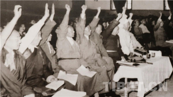 图为1959年6月28日至7月17日,西藏自治区筹备委员会举行第二次全体会议,一致通过《关于西藏全区进行民主改革的决议》。
